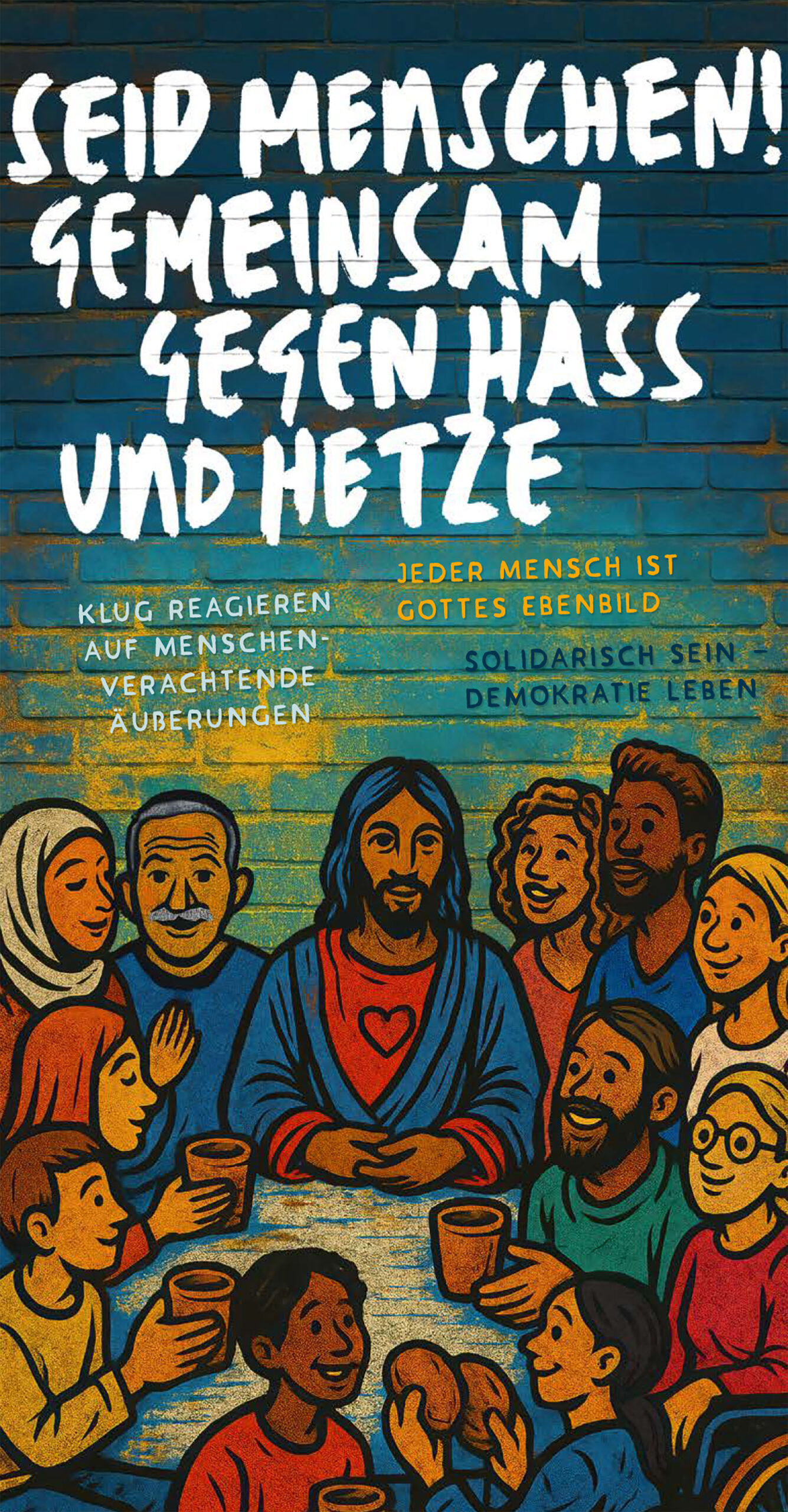 Bereits das Titelbild der Handreichung berührt mich zudem sehr: Wir sehen Jesus in Tischgemeinschaft mit Menschen unterschiedlichen Alters, unterschiedlicher Herkunft und Religion – und auf seiner Brust ein Herz. Die Menschen wirken angesteckt von Jesu Ausstrahlung: Sie lächeln einander offen an, teilen Brot und Wein miteinander. Jesus ist als Herz-Mitte unter ihnen – bleibend lebendig. Jesu Blick auf den Menschen kommt aus dem Herzen. Und so begegnen sich Menschen in der Nachfolge Jesu: mit dem Herzen.