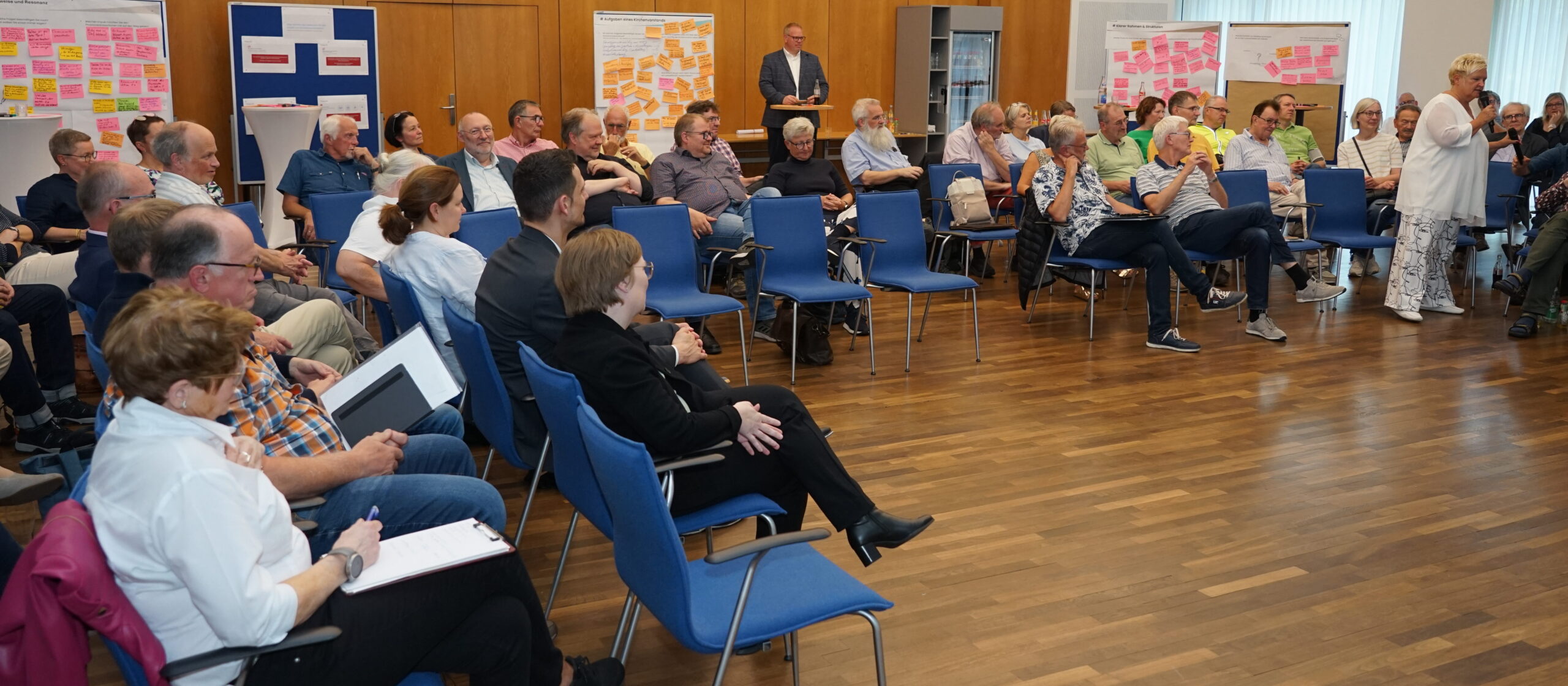 An Stellwänden diskutierten die Kirchenvorstände mit den Projektverantwortlichen über Rollen und Aufgaben, Unterstützungsbedarfe, Formen des Engagements, Strukturen der Zusammenarbeit und zentrale Werte, die auch in Zukunft Bestand haben sollten. Auch allgemeine Resonanzen zum Bistumsprozess wurden gesammelt.