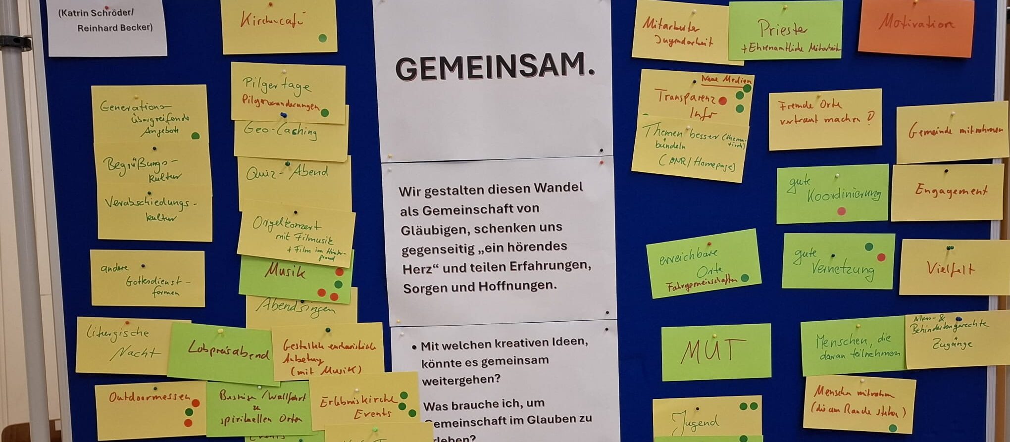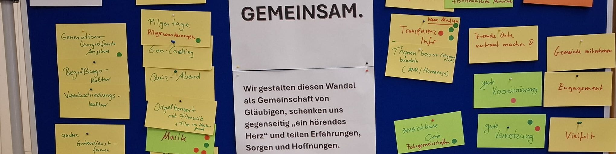 In moderierten Kleingruppen tauschten sich die Teilnehmenden über Erfahrungen, Erwartungen und konkrete Impulse für den Pastoralen Raum Marsberg aus. Die Gruppenphasen dienten der Vernetzung, dem Austausch von lokalen „good practices“ und der Erarbeitung erster Ideen für eine partizipative Umsetzung vor Ort. Einzelne Ergebnisse von den verschiedenen Stellwänden sind als Bildpräsentation auf der Homepage www.marsberg-kirche.de nachzulesen.