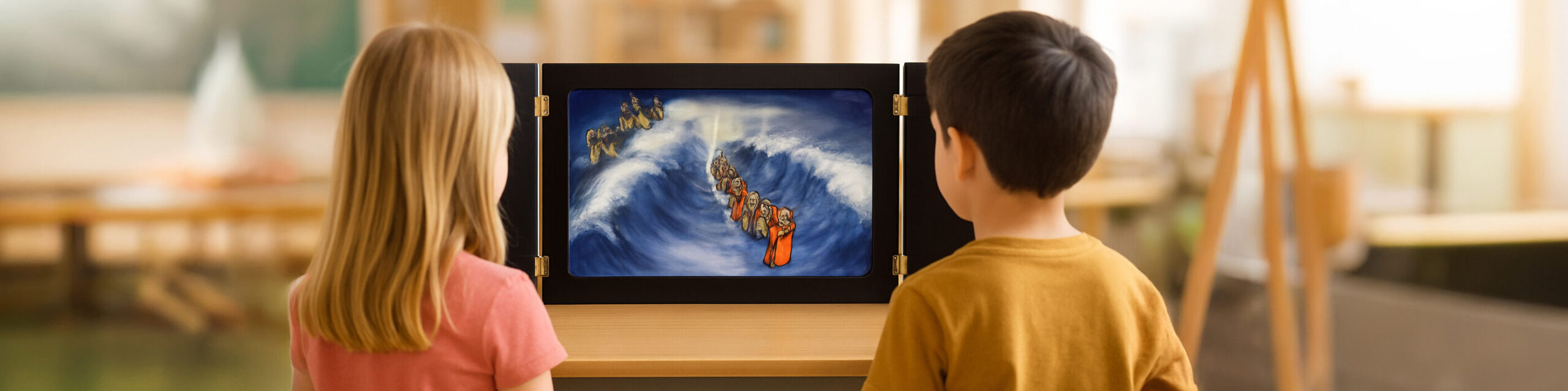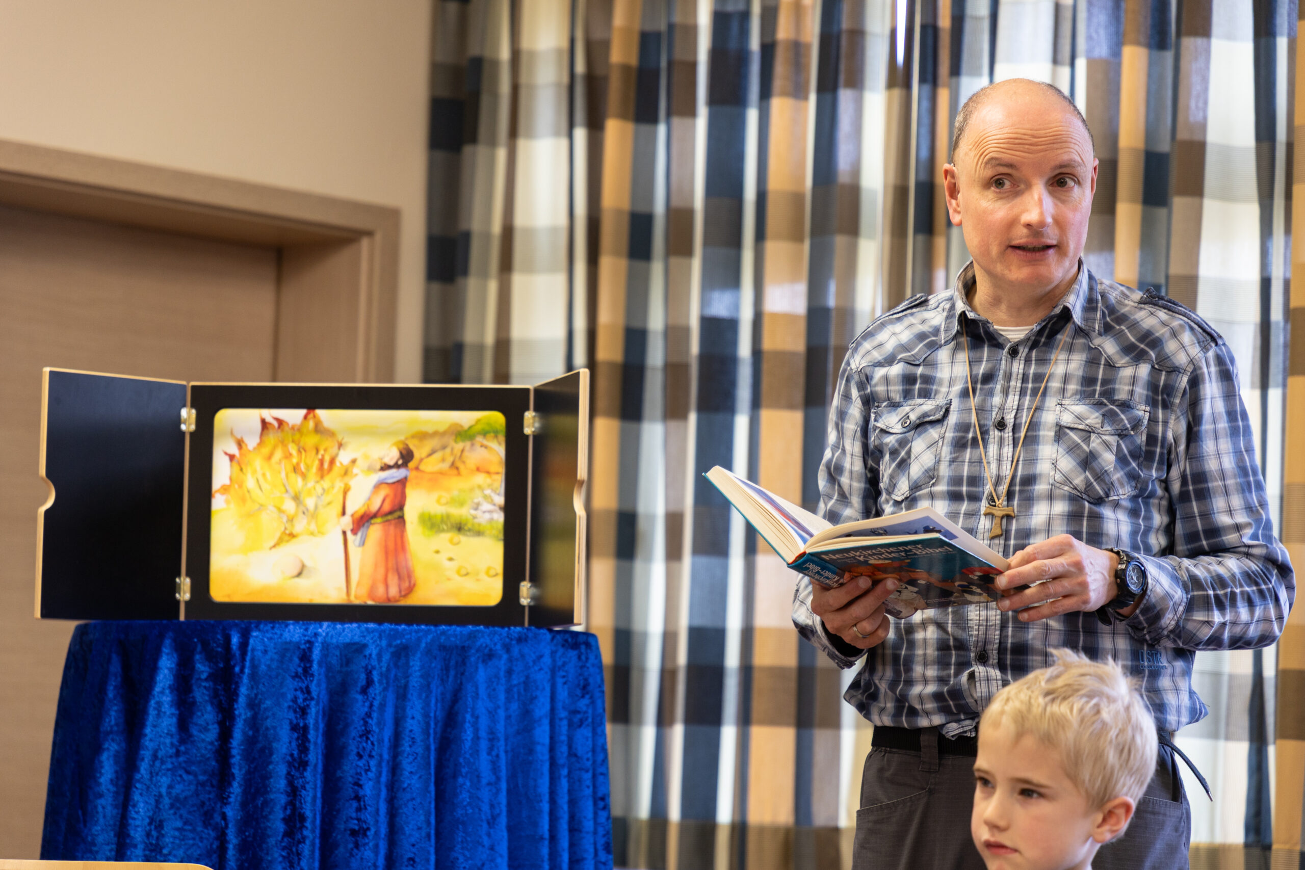Christof Stracke klappt das Kamishibai auf. Mit seinem Holzrahmen sieht es fast wie ein Kasperle-Theater aus. Und ja: Ums Geschichtenerzählen für Kinder geht es auch hier – nur eben um biblische Geschichten. Statt mit Puppen ist das Kamishibai mit handgemalten Illustrationen bestückt. Acht Kinder hat Gemeindereferent Stracke im Gemeindezentrum Delbrück-Sudhagen bei Paderborn im Stuhlkreis um sich versammelt. „Mose und die große Rettung“ ist das Thema dieses Bibelnachmittages für Sechs- bis Zehnjährige. Christof Stracke zeigt auf das erste Bild und liest aus seinem Buch: „Im Palast bekam Mose kostbare Kleider. Mose sah nun aus wie ein Ägypter. Er sprach auch wie ein Ägypter. Aber er blieb Israelit. Er konnte sein Volk nicht vergessen.“ Die Kinderaugen sind weit, die Ohren gespitzt. In den Köpfen wird eine mehr als 3.500 Jahre alte Geschichte zu neuem Leben erweckt.