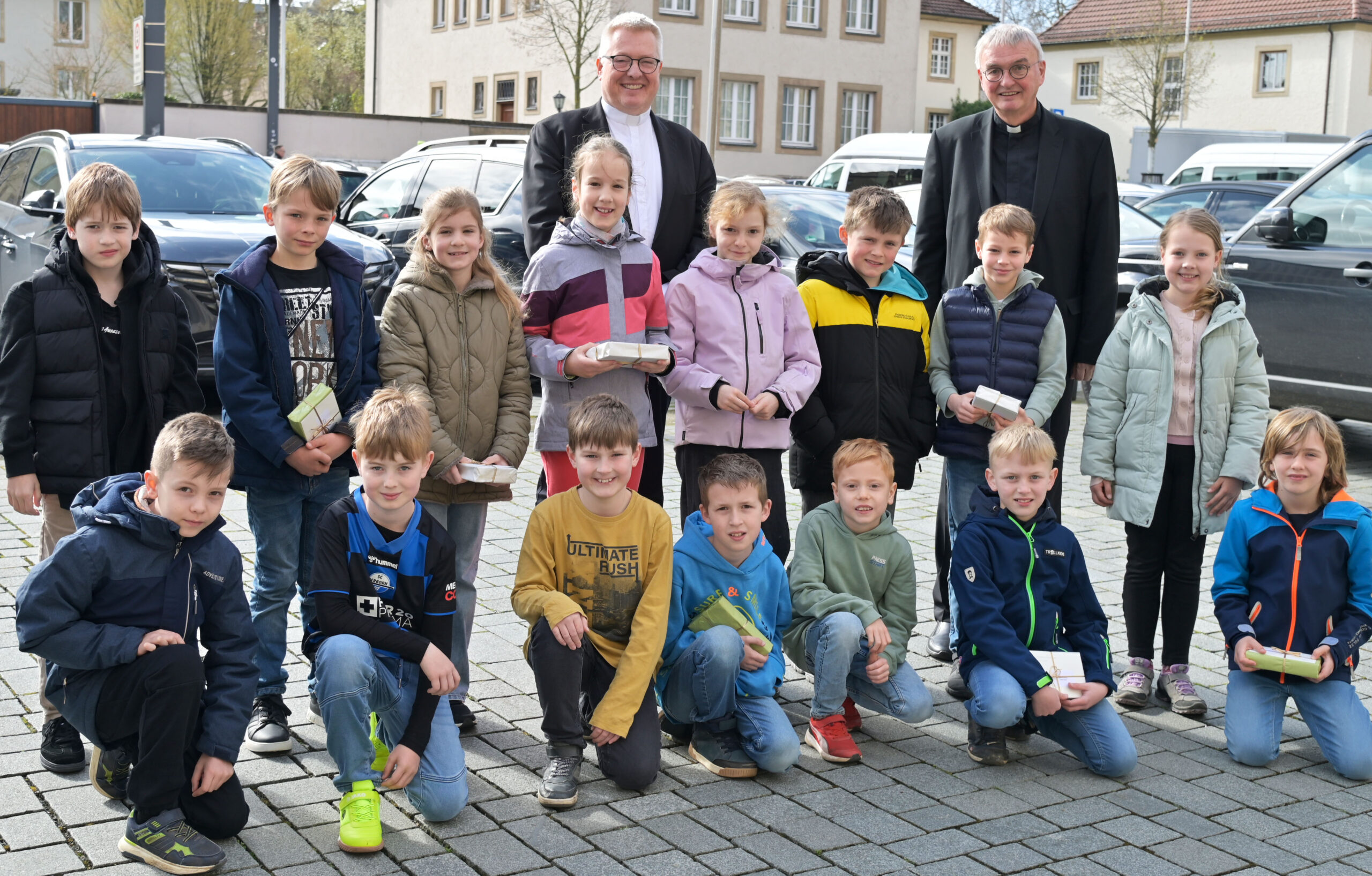 16 Mädchen und Jungen, die nach Ostern zum ersten Mal die heilige Kommunion empfangen, waren am 1. April 2026 zu Gast im Erzbischöflichen Generalvikariat: Die beiden Generalvikare Dr. Michael Bredeck und Thomas Dornseifer gratulierten den Kommunionkindern, deren Eltern für das Erzbistum arbeiten – eine gute Tradition seit vielen Jahren. Neben einer spannenden Führung durch den Hohen Dom erwartete die Kinder ein Geschenk: ein Gotteslob mit Widmung von Erzbischof Dr. Udo Markus Bentz.