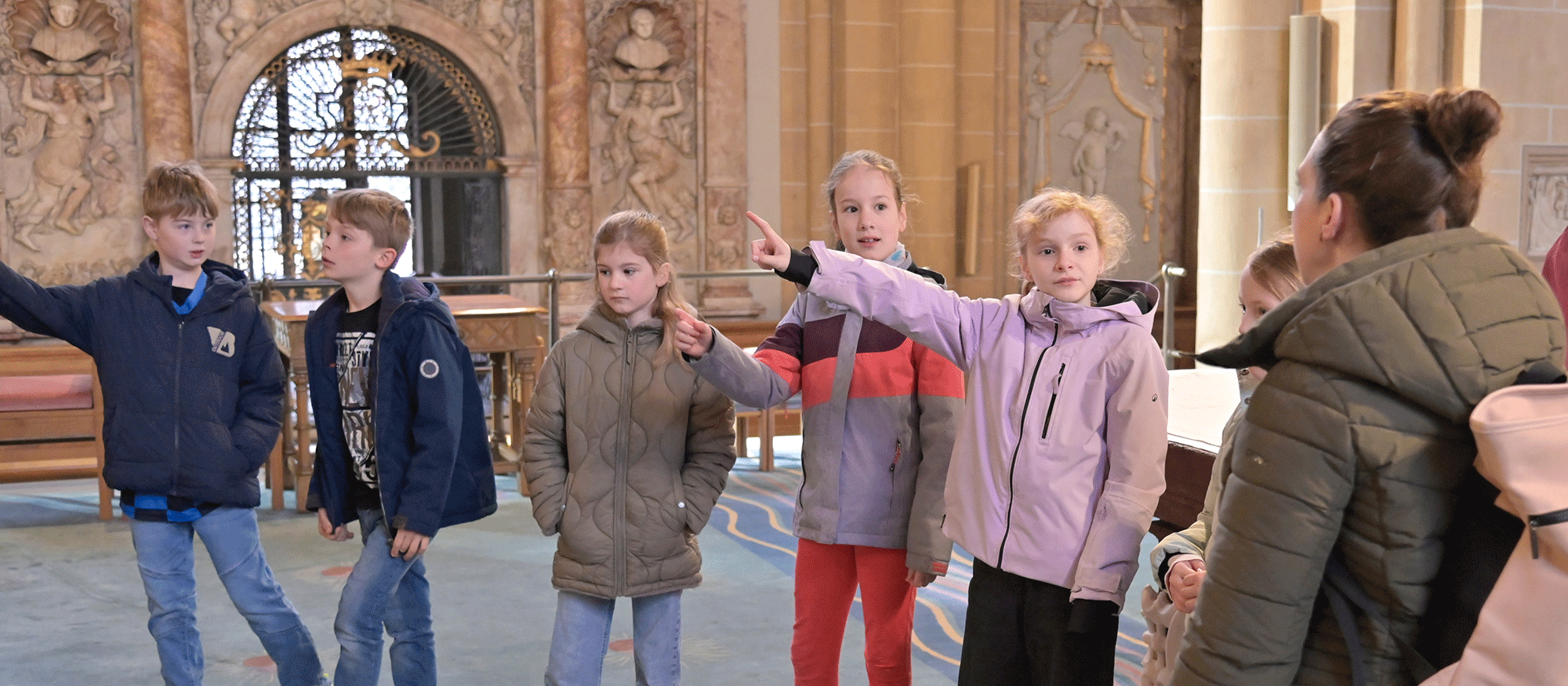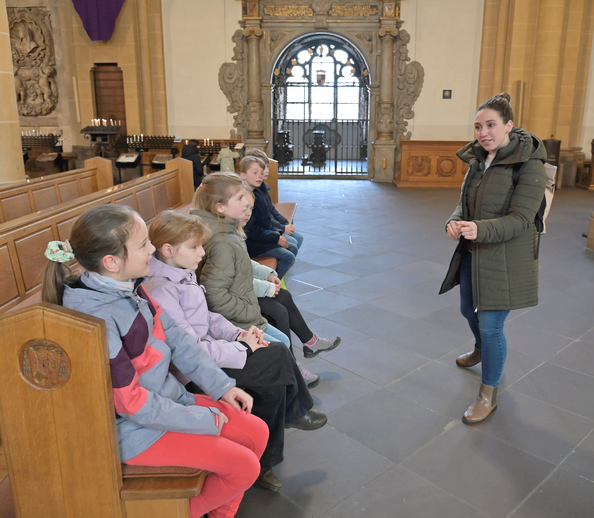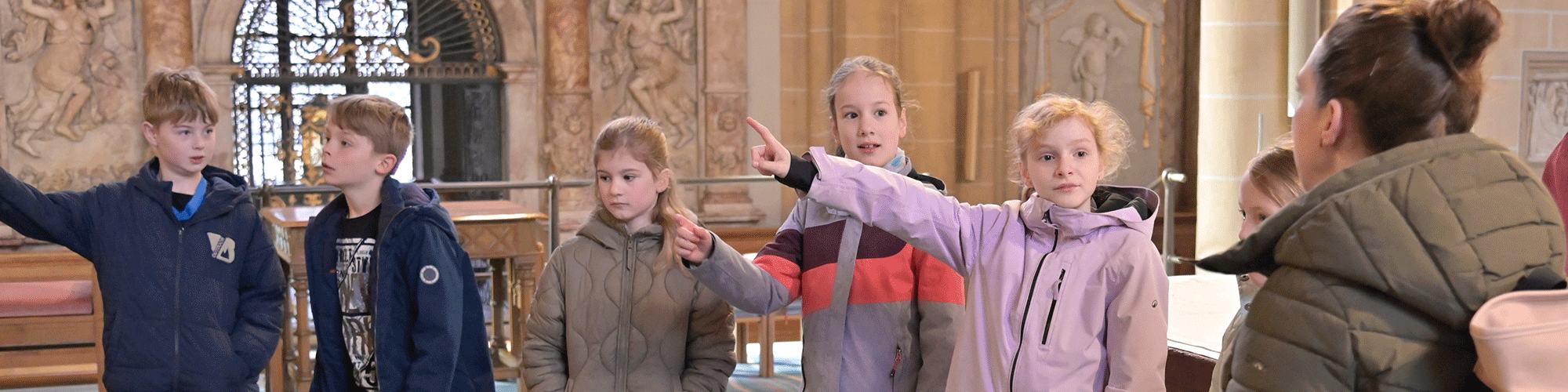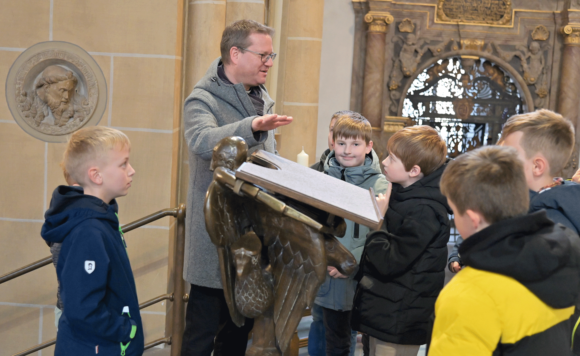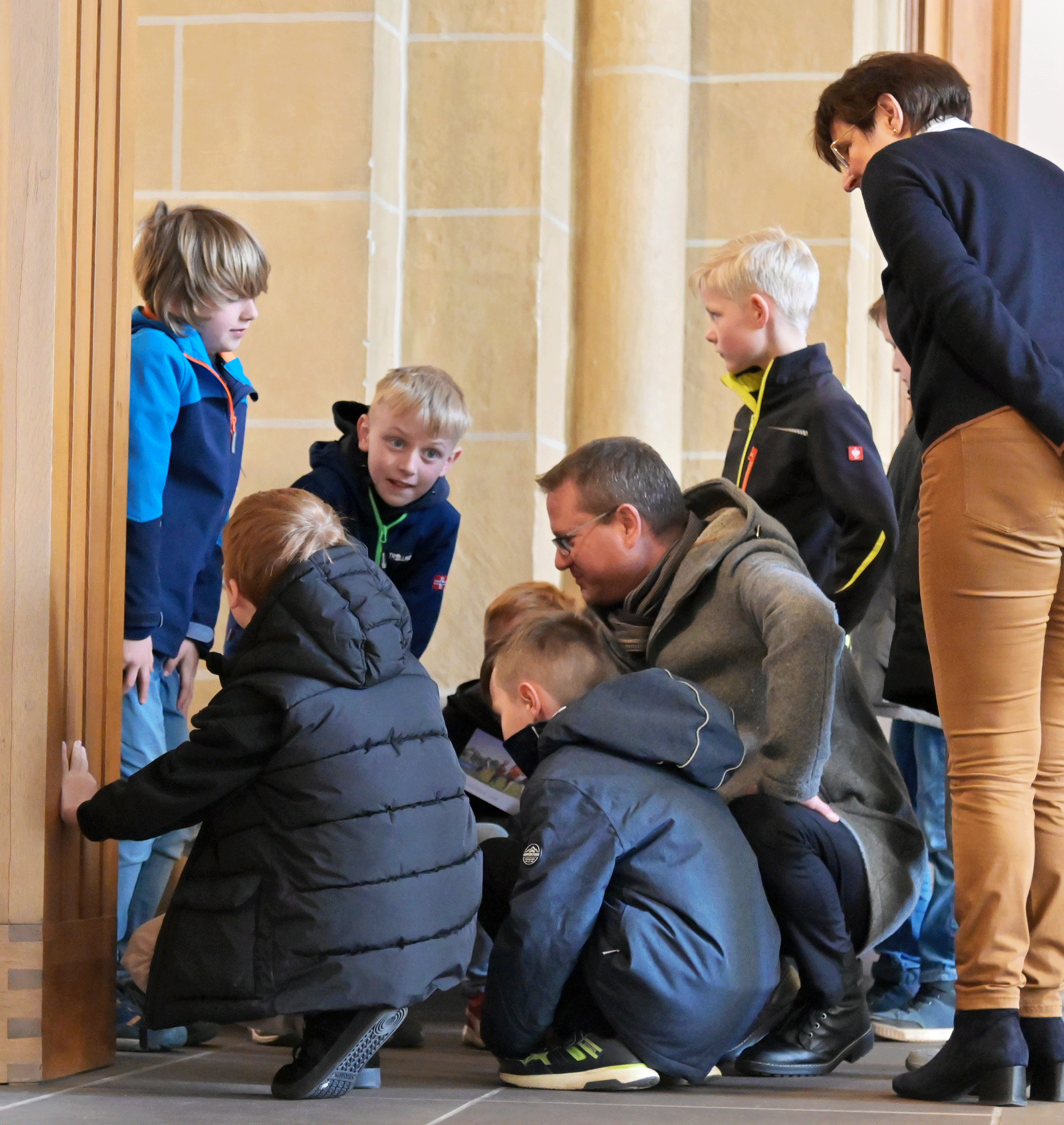 Sehen, wo Mama oder Papa arbeiten, deren Chefs kennenlernen und den großen Paderborner Dom erkunden – das stand für die 16 Mädchen und Jungen auf dem Programm, als sie am Mittwoch vor Ostern das Generalvikariat besuchten. Erster gemeinsamer Treffpunkt war das Foyer des Generalvikariats, wo zunächst Generalvikar Thomas Dornseifer Eltern und Kinder begrüßte und die Kinder dann direkt auf ihre Entdeckungsreise durch den Dom schickte. Domvikar Christian Städter und Joana Drießen, Gemeindereferentin am Dom, erwarteten die Mädchen und Jungen dort mit spannenden Geheimnissen der Bischofskirche. Die Generalvikare Thomas Dornseifer und Dr. Michael Bredeck tauschten sich während der Erkundungstour der Kommunionkinder mit den Eltern aus – in dieser Konstellation mit beiden Generalvikaren keine alltägliche Gesprächssituation und deshalb für alle Mitarbeitenden eine wertvolle Erfahrung.